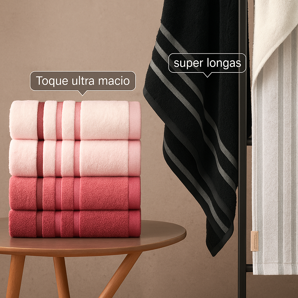 ✅ Extremamente longas e com um tecido egípcio premium. ✅ Tecnologia de alta absorção para uma secagem mais eficiente. ✅ Toque suave e aveludado, proporcionando um conforto excepcional. ✅ Tecnologia antibacteriana , garantindo a sua saúde e bem estar.